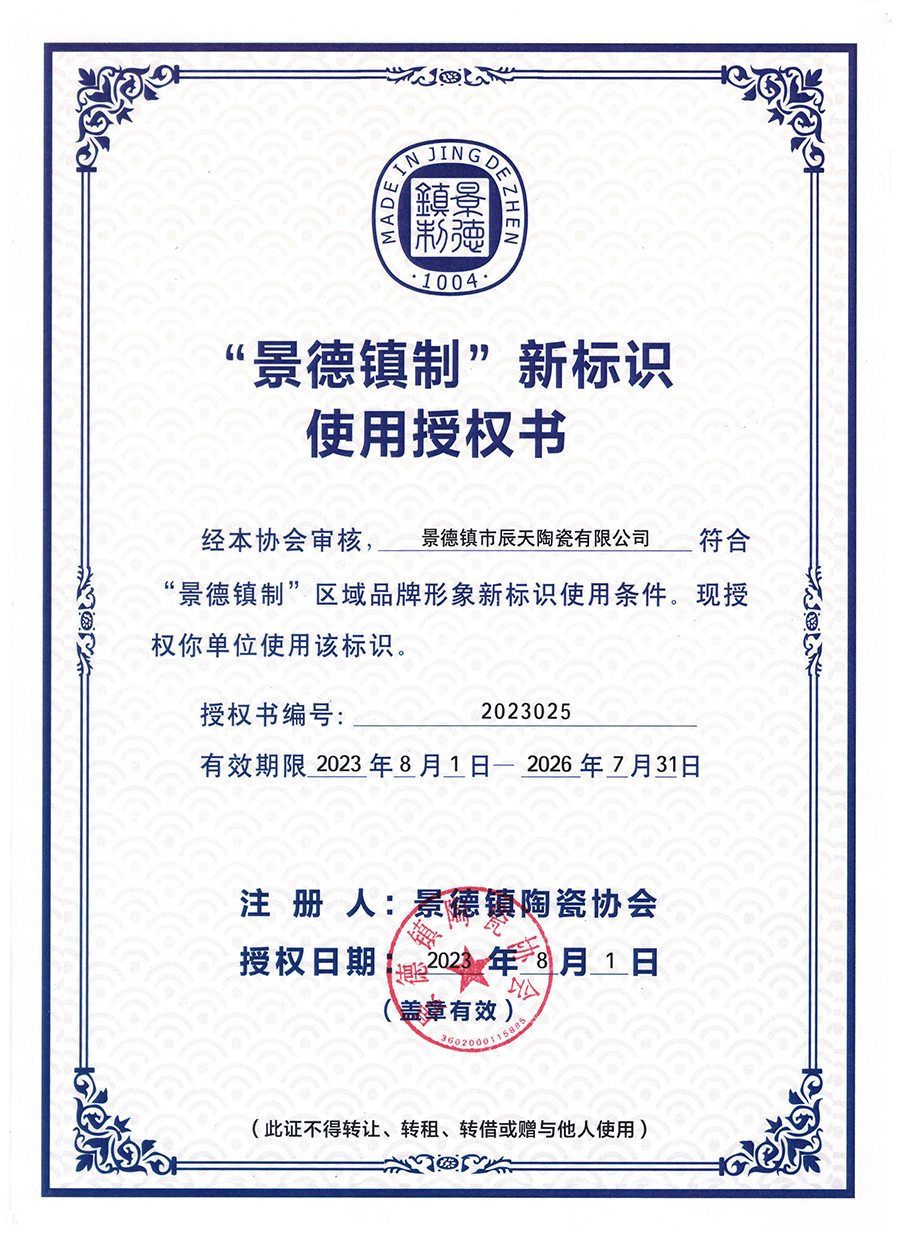景德鎮市辰天陶瓷深耕陶瓷產業多年,是一家立足于景德鎮本土的陶瓷文化企業。很榮幸能得到“景德鎮制”新標識使用授權,在今后辰天陶瓷必將不忘初心,將傳統文化與現代創新相結合,為景德鎮陶瓷文化的發展貢獻出自己的一份微薄之力。